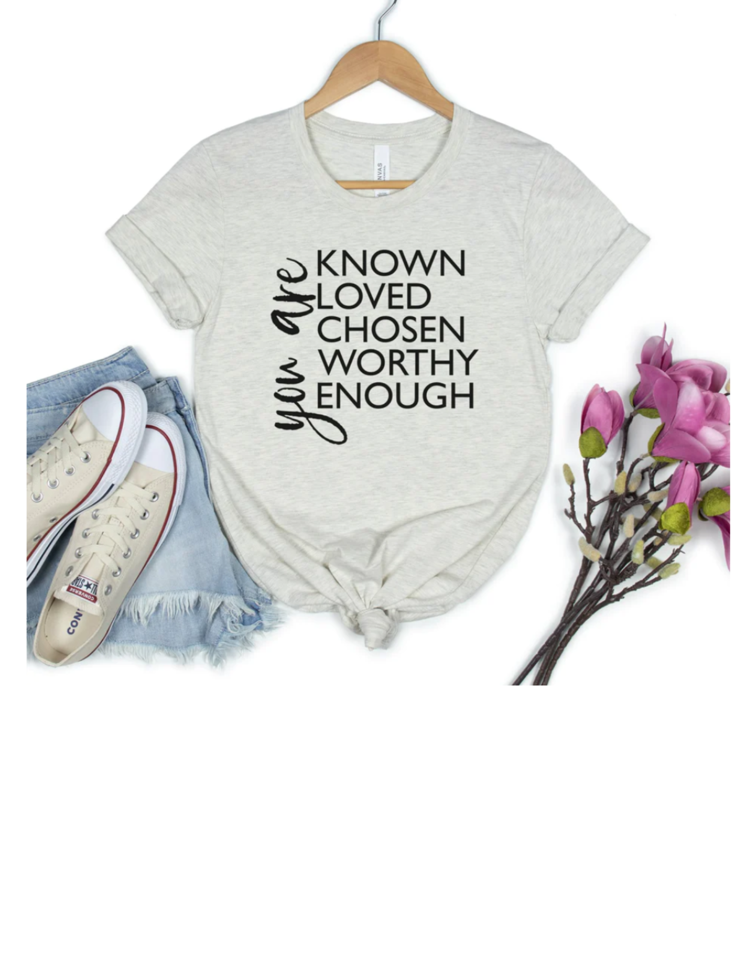 We sometimes wear so many hats we lose sight of who we really are. As you wear this loving t-shirt be self-confident that you are known, loved, chosen, worthy, enough.